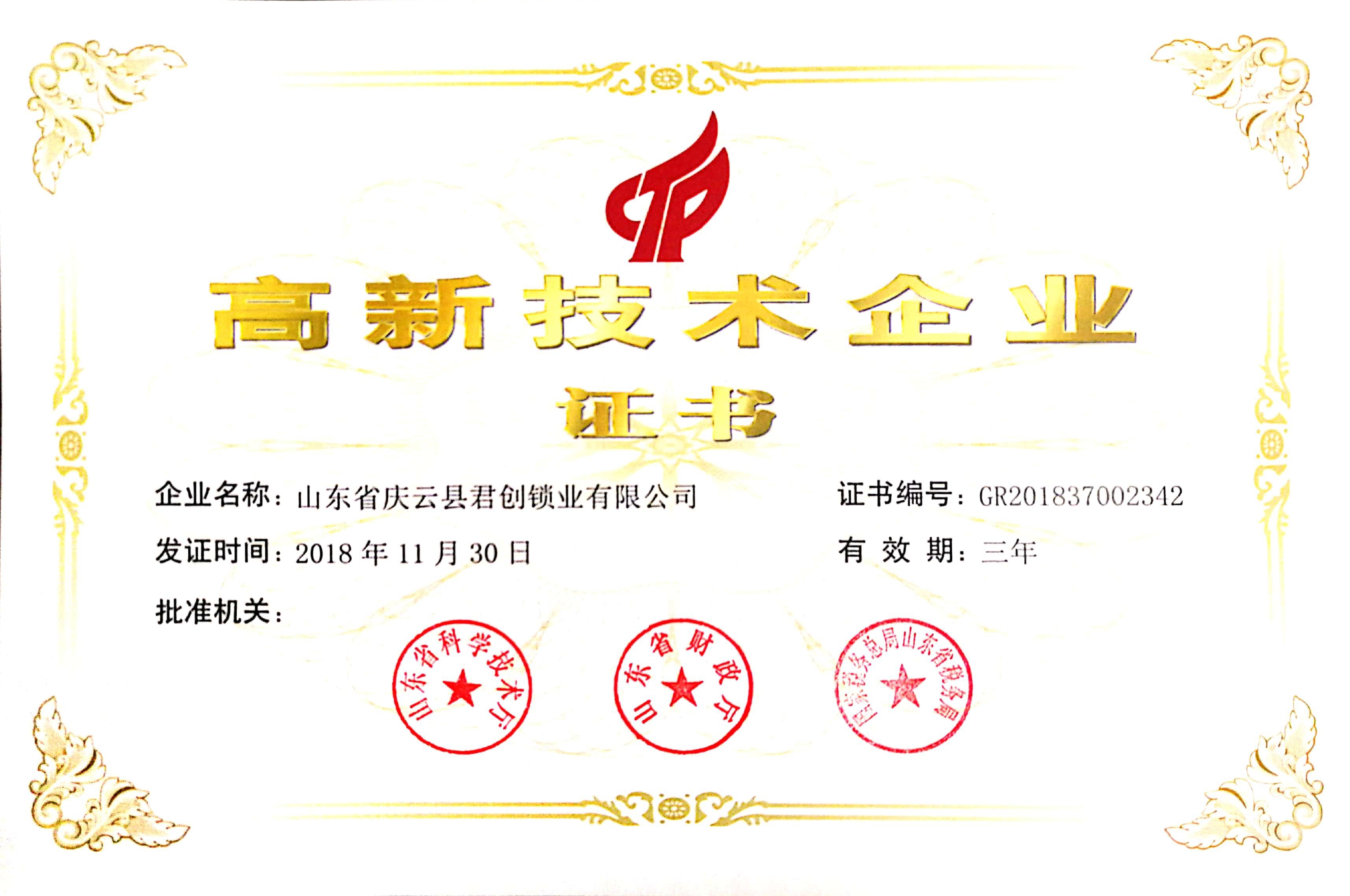近日,君創(chuàng)鎖業(yè)喜迎佳音,獲得了“國家高新技術(shù)企業(yè)證書”。這是君創(chuàng)鎖業(yè)繼獲得山東省產(chǎn)品質(zhì)量獎、德州市信用民營企業(yè)、等榮譽后獲得的一項新的榮譽。